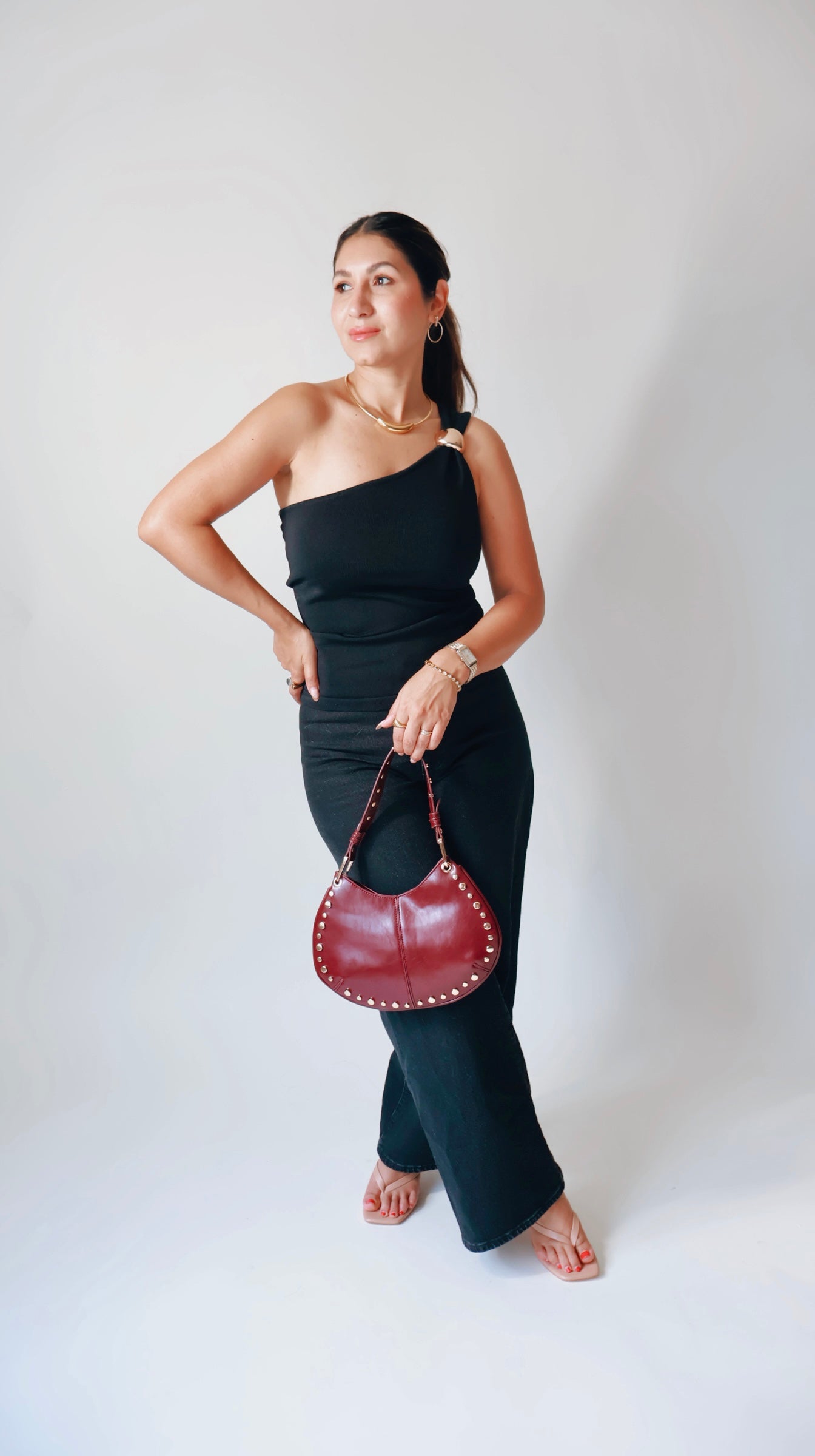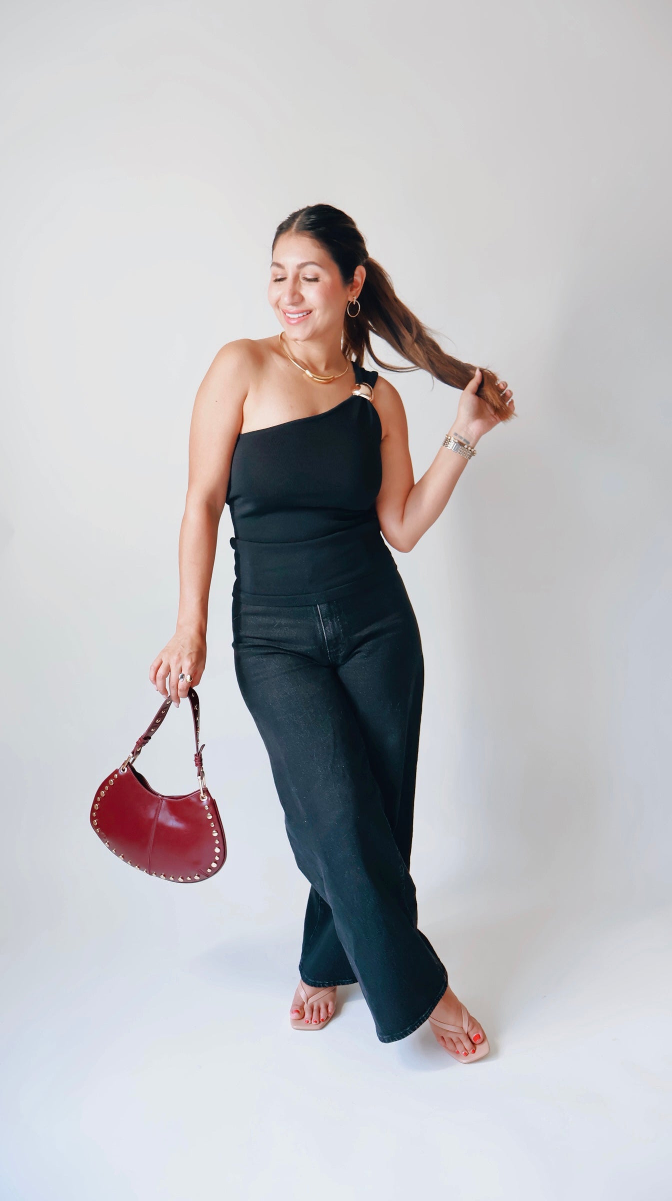 Turn heads on your next date night with our Gold Charm One Shoulder Top. The asymmetrical design and gold pendant detail make it a statement piece, while the ribbed fabric keeps you feeling snatched. A must-have for a flawless evening look!
