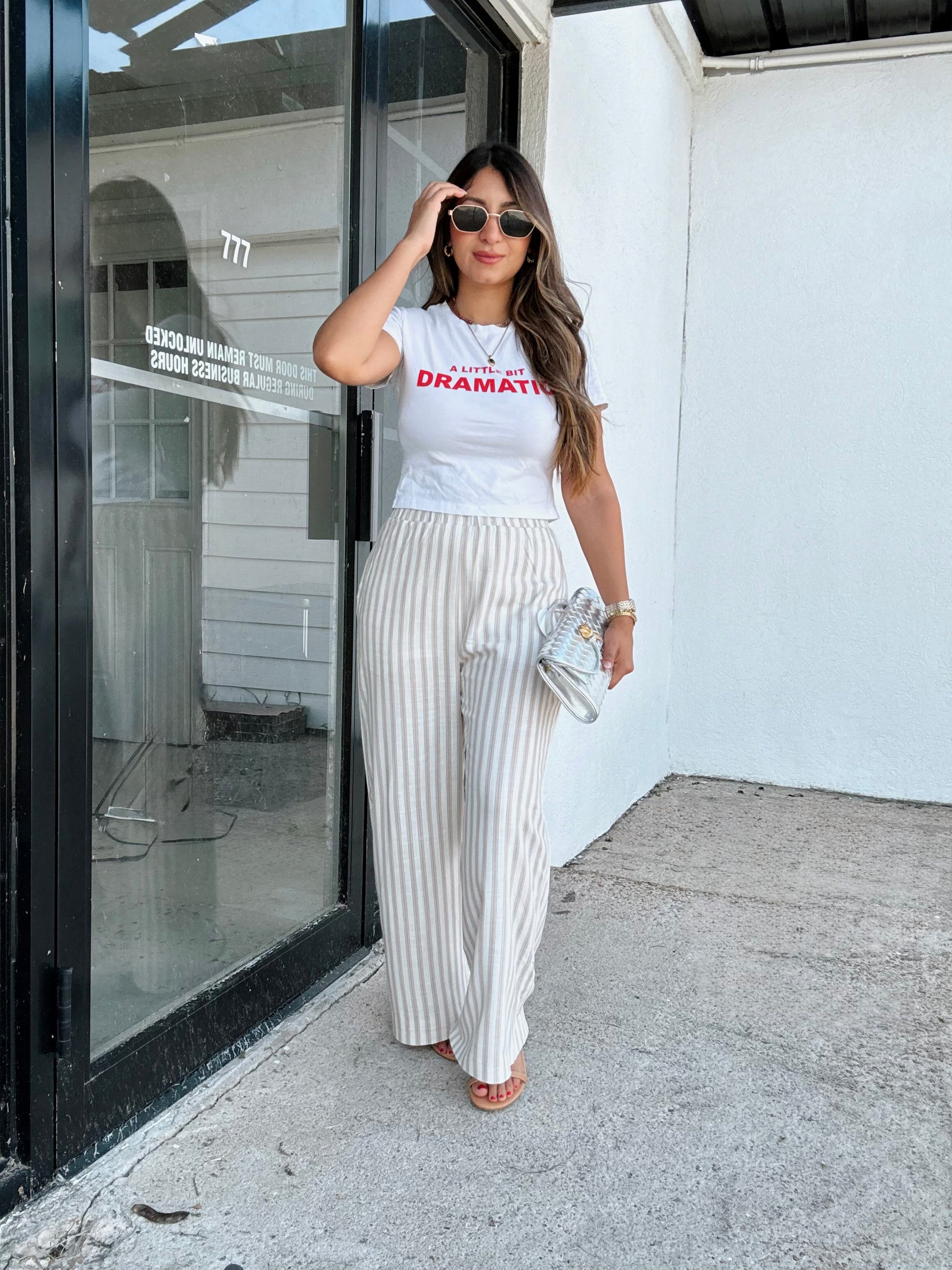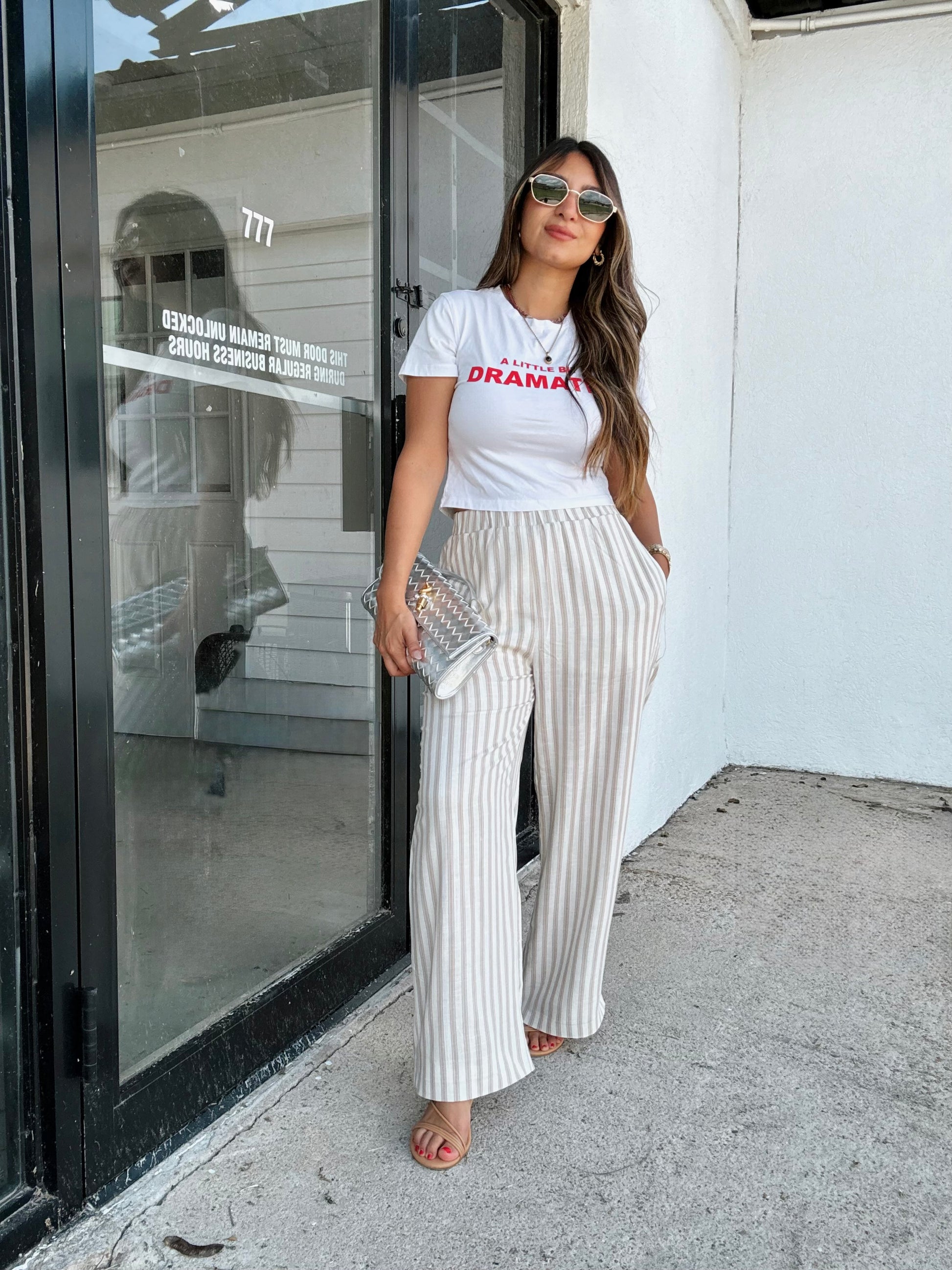 Experience ultimate comfort with these lux striped Linen pants featuring a high elastic waistband, convenient pockets, and elegant pleat accents. Made from a lined linen blend, they offer a wide-leg fit and a timeless stripe design for a chic, relaxed look.