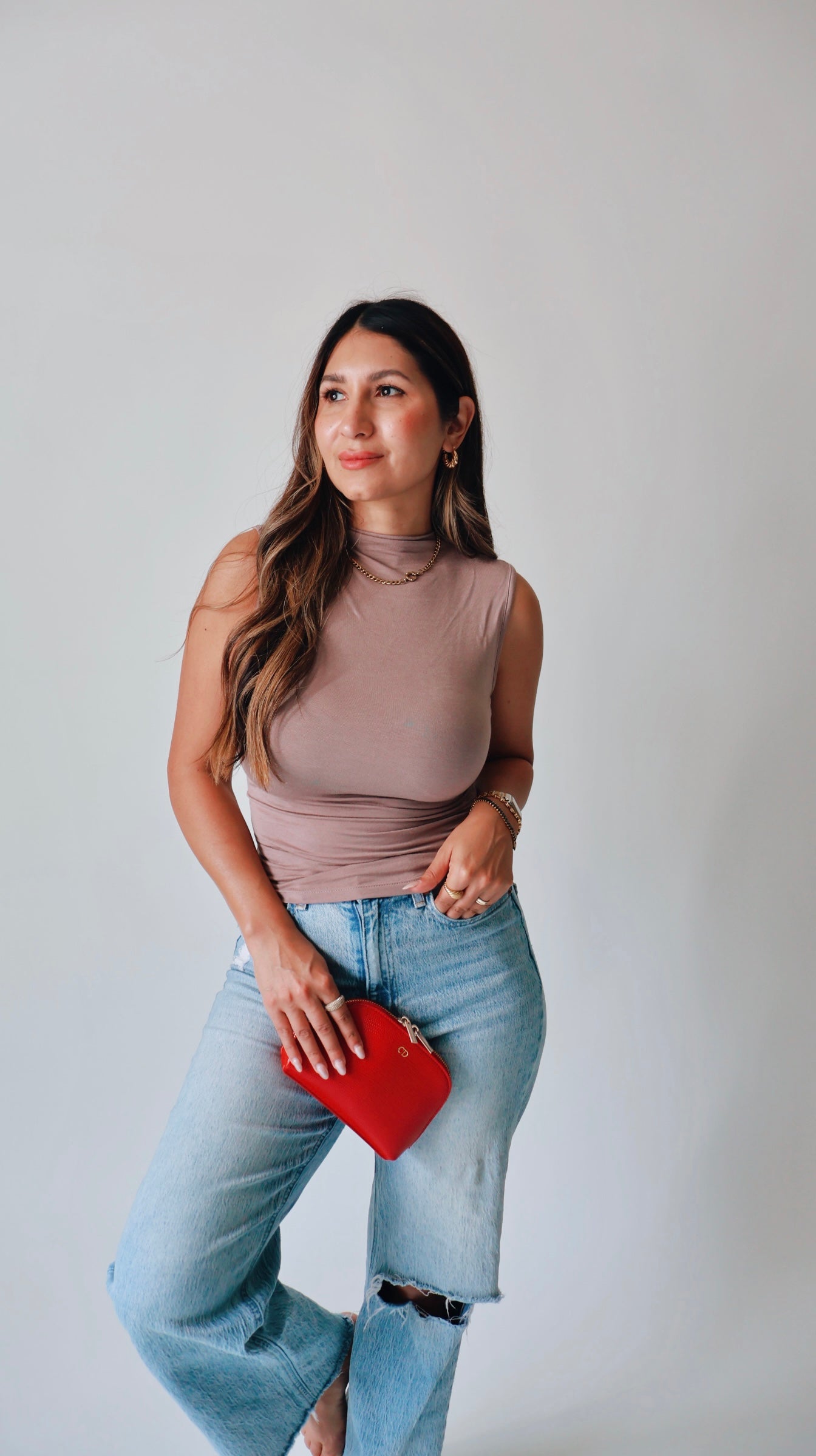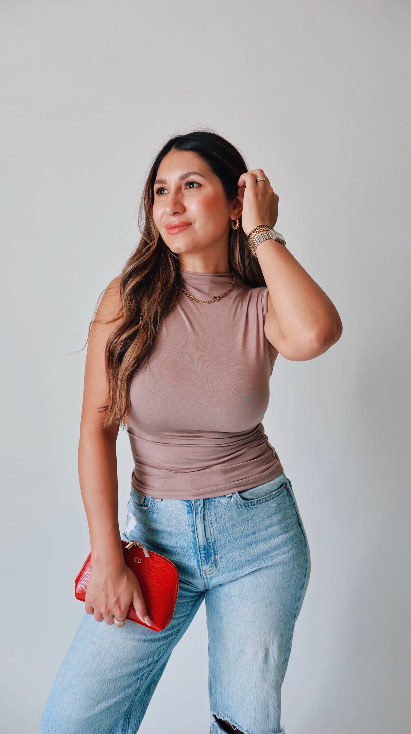 Mock Neck Ruched Mocha Top- Mocha/Taupe